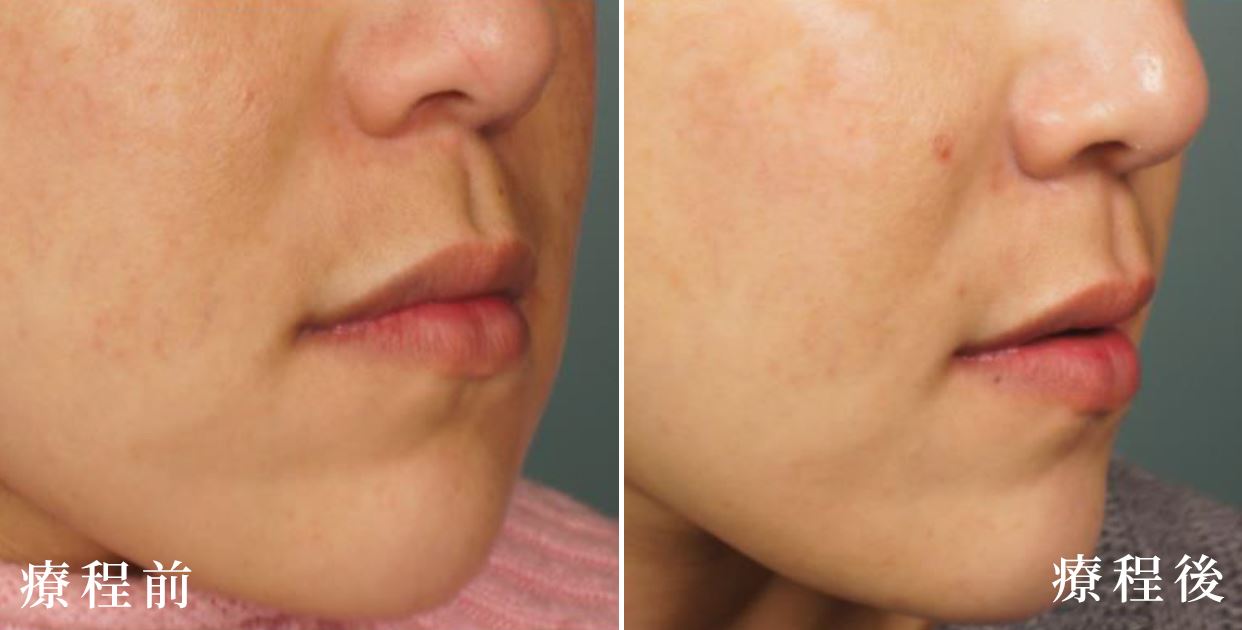 療程利用800nm-1400nm波長能量,以45℃最佳熱能深入真皮層,刺激膠原蛋白即時收縮,肌膚立即收緊